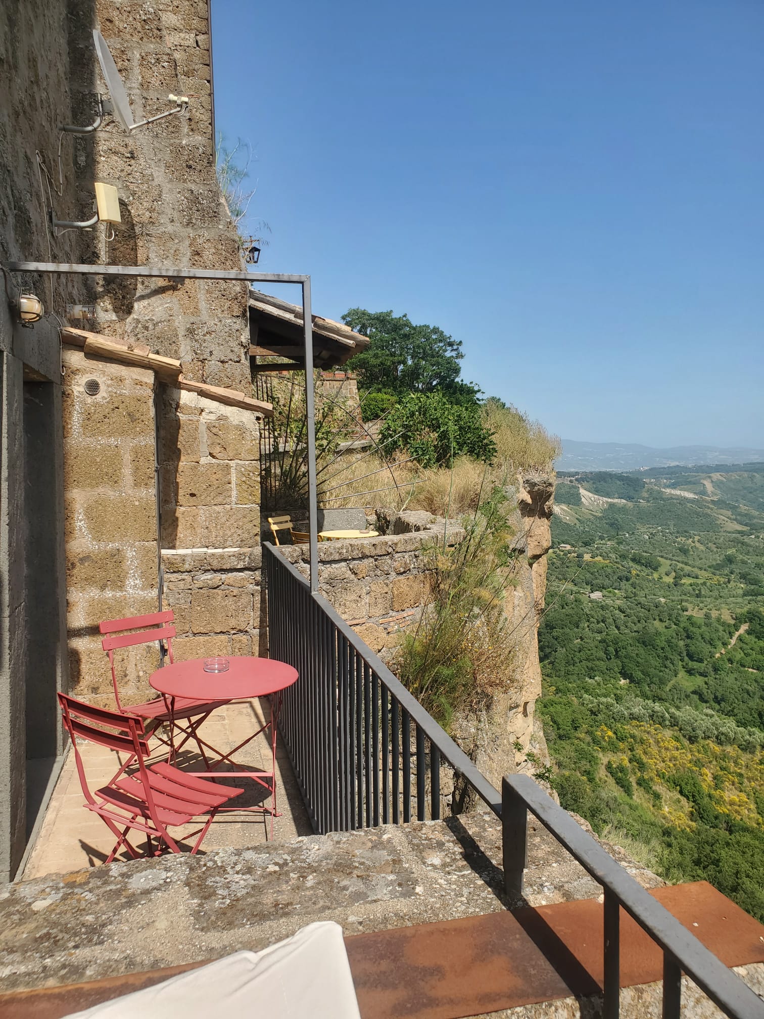 We always wanted to stay overnight in this magical place and finally had the opportunity to do so last month during our most recent stay in Bella Italia. As you can see from the photos and video, it’s not difficult to understand why the Civita is known as the dying or floating city. As I explain in my book Italy’s Shrines and Wonders, it is built on a hill that sits in the middle of a valley filled with crumbling rock. The Civita is in quite the precarious position as due to the ongoing erosion the town is slowly shrinking. And when there is cloud cover in the valley, the Civita appears to be floating above them.